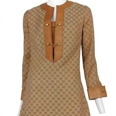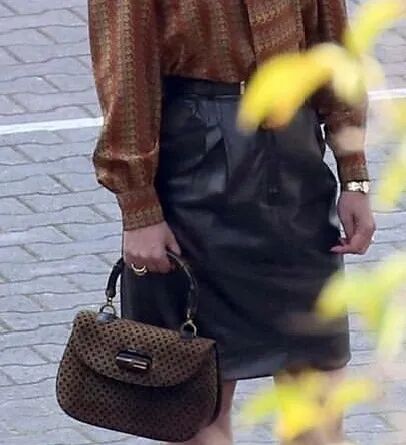 剧中Lady Gucci的衣橱里,除了琳琅满目的Jewelry和Fur,剩下最多的一定是老花印纹的衣服。比如这件老花喇叭裤,上面搭条纹Fur,下面是红色高跟鞋,简直太“Gucci”了。我最爱的还有她这身1990s的Gucci老花连衣裙,不仅清爽好看,细节之处也是有很多小心思。这件连衣裙的袖口和领口的部分是棕色皮质的,上面的衔扣也是Gucci Vintage里常见的马蹄铁扣造型。十分chic!这条连衣裙可是那个时代的C位裙款,你会发现即使现在穿也一样时髦。曾更绝的还有Jackie 1961款,和去年秋冬Gucci复刻的Jackie腋下几乎一模一样,真是一组谁穿谁是时髦精的造型!