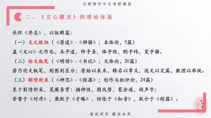 我们再来看一看《文心雕龙》的研习方略。每位同学还是要根据考研的实际情况来。有的学校对它的考察相对容易,有的则相对有深度。