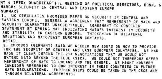 德国《明镜周刊》发表文章披露,在一份1991年的会议纪要中显示,英、美、法、德外交官曾在德国统一谈判期间明确向俄罗斯(苏联)承诺,北约组织不会扩展至波兰及更东边的地区