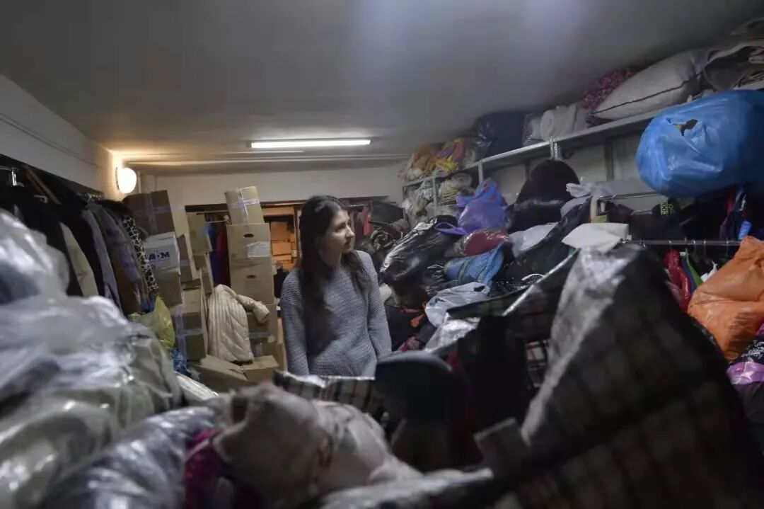 2月26日,在俄罗斯顿河畔罗斯托夫市,志愿者整理当地居民为来自顿巴斯地区难民捐赠的物资