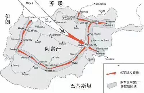 1979年苏联发动入侵阿富汗的战争,图为苏军入侵阿富汗路线图