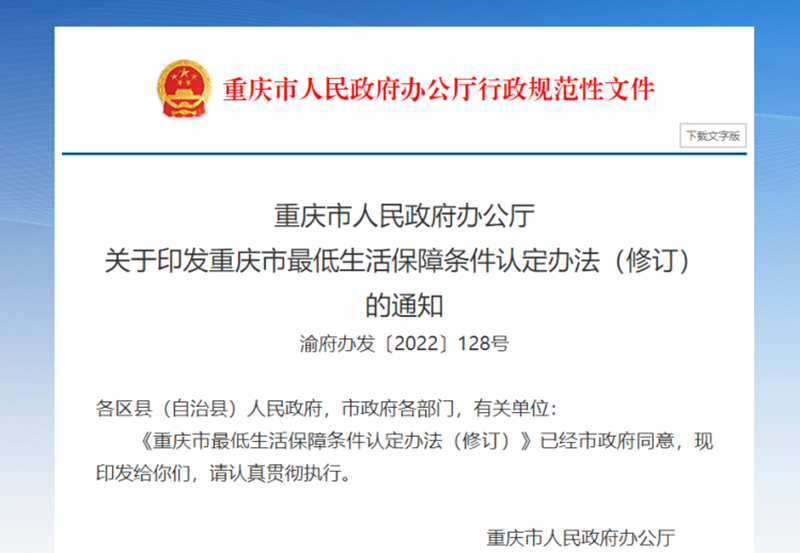 近日,市政府出台《重庆市最低生活保障条件认定办法(修订)》(以下简称《办法》),对低保认定条件进行了优化调整,进一步强化困难群众基本生活保障。
