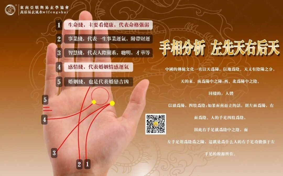 基本上手相观察以男左女右为主,万灵易玄手相告诉我们左手对男性而方寓意着先天的支配,右手则代表后天的影响,而女姓正好相反。话虽如此,观察手相时最好还是以自己习惯使用的手为主,因为它代表着后天运。一般人使用左手都无法像右手一样灵活,但对左撇子而言,他的左手就代表着后天运,右手则为先天运。因此,貫用左手还是右手,对手相观察会产生非常大的差异。还有个更精确的说法是:右手掌控人后天的运势与吉凶的判断力达到八成左右;相对的,左手就只有两成左右的影响力。