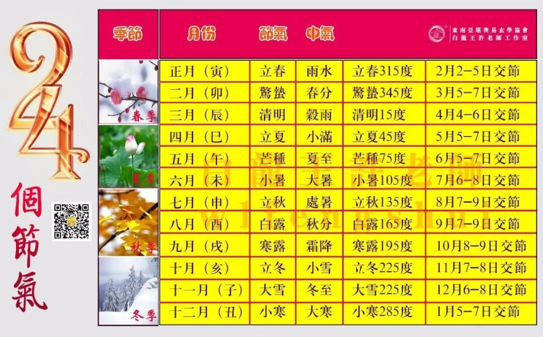 在人类的文化中,以一年也是回归年划分了二十四个节气,与现代历法将一日,平太阳日划分为二十四小时作为计量单位,两者在数据上都是相同的比拟;24个节气除了太阳运行周期之外,也作为确定闰月的标准;这24个节气分为立春、雨水、惊蛰、春分、清明、谷雨、立夏、小满、芒种、夏至、小暑、大暑、立秋、处暑、白露、秋分、寒露、霜降、立冬、小雪、大雪、冬至、小寒、大寒。24个节气在农业时代是做为指导农务耕作的律表,在中医和玄学的领域中则以4个节季作为养气生息和转换磁场,改变运势的好时机。