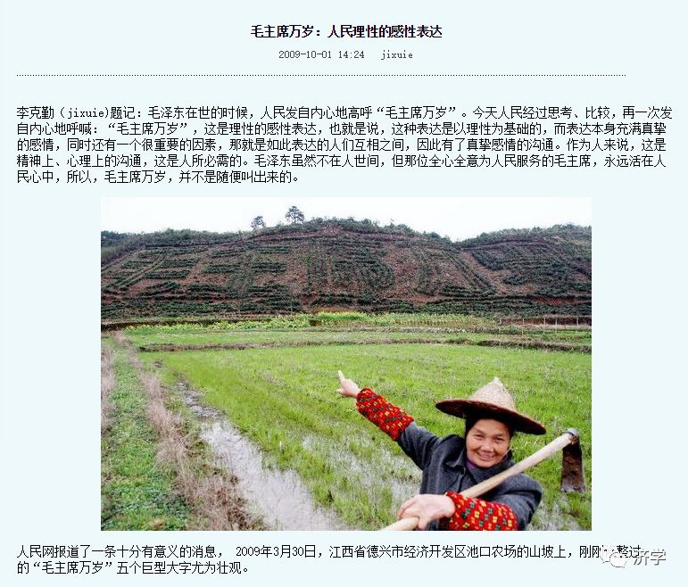 济学:毛主席去世后发生的事情,的确给我们长了很多见识。例如,把“毛主席万岁”当做个人崇拜来说事,是典型的攻其一点不及其余。因为,与人民高呼“毛主席万岁”的同时,有毛主席高呼“人民万岁”的事实存在。这能和封建社会的那种万岁文化相提并论?此道,非彼道也。世间同样的器,背后的道可以不同。这就好比现象相同,本质不同一样。解放战争时期,许多国民党士兵,昨天为国民党打仗,今天起义了为人民打仗,把这两天的打仗说成一样,说得通吗?