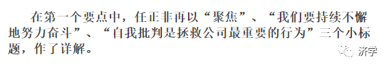 任正非还谈到,这个时代前进得太快了,若华为自满自足,只要停留三个月,就会注定会从历史上被抹掉。正因为华为长期坚持自我批判不动摇,才活到了今天。去年,董事会成员都是架着大炮《炮轰华为》,“中高层干部都在发表《我们眼中的管理问题》,厚厚一大摞心得,每一篇的发表都是我亲自修改的。”