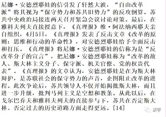 应当指出,当时苏共党内和领导层中间对待这场“历史热”的态度是不一致的。苏共政治局委员利加乔夫和政治局委员、克格勃主席切布里科夫都反对“意识形态的多元化”和片面地丑化苏联历史。切布里科夫警告说,帝国主义的密探正在赞助一些作家去丑化苏联的历史。[13]对于反思历史、翻历史旧帐,苏联社会中不但历史学界深表担忧,苏共普通党员和群众中反对丑化历史的声音也很强烈。1988年3月13日,《苏维埃俄罗斯报》发表了列宁格勒技术学院女教师尼娜·安德烈耶娃的一封读者来信,题为《我不能放弃原则》。来信批评了社会中涌动的一股股“反思历史潮流”,指出,当前报刊上轰动一时的文章只能教人迷失方向,是给社会主义的苏联抹黑。文章提出了当时舆论界许多不正常的现象:如非正式组织活动,宣扬应该实行西方的议会分权制,否认党和工人阶级的领导地位,恶毒攻击苏联历史等。文章指出,“改革”进行几年了非但未见成效,反而导致生活水平下降。改革缺乏明确的纲领和目标,隐藏着世界主义的倾向。文章发表后,一些州的报刊纷纷转载,一些党组织开始讨论。