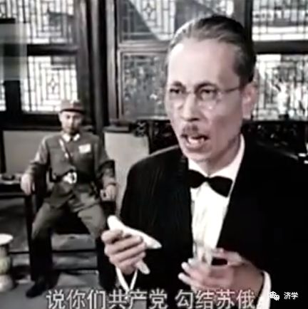 在黄主任把手持双枪颟顸“草包”贺老五,手持文明棍的瘸腿特务段泽民,腕套佛珠粗野骄横的刘玉坤(刘大麻子),国民党参议蒋公任身着长衫,等等,一个一个驳倒之后,穿西装打黑领结并蓄“仁丹胡”汪伪汉奸汪光夏出场了。