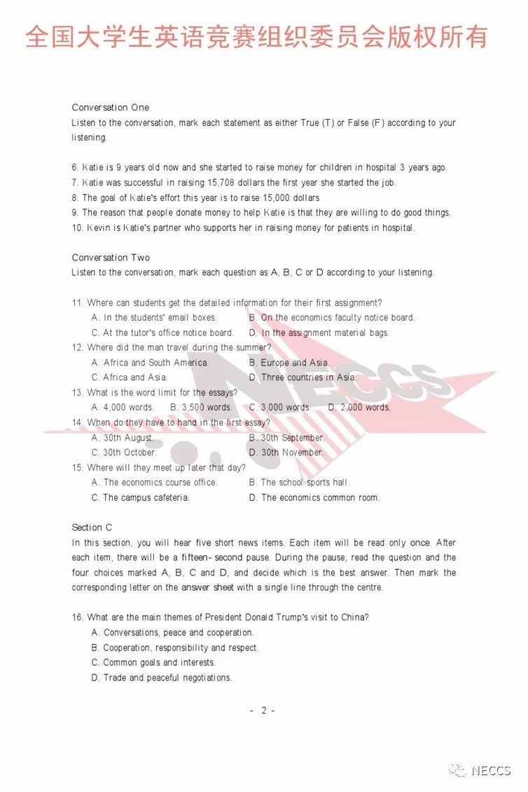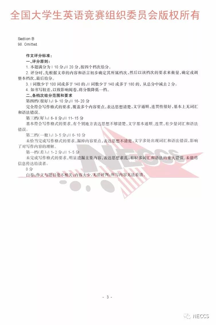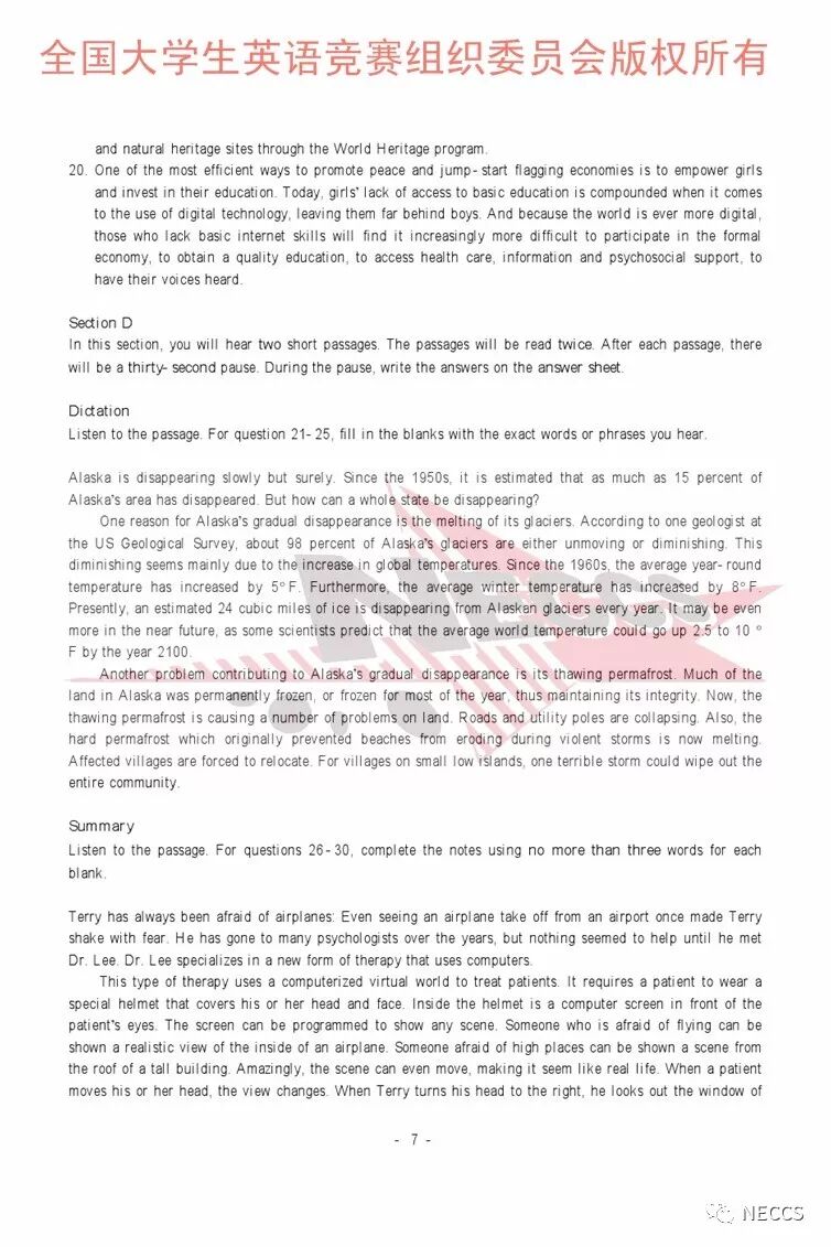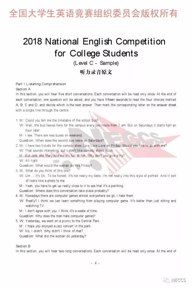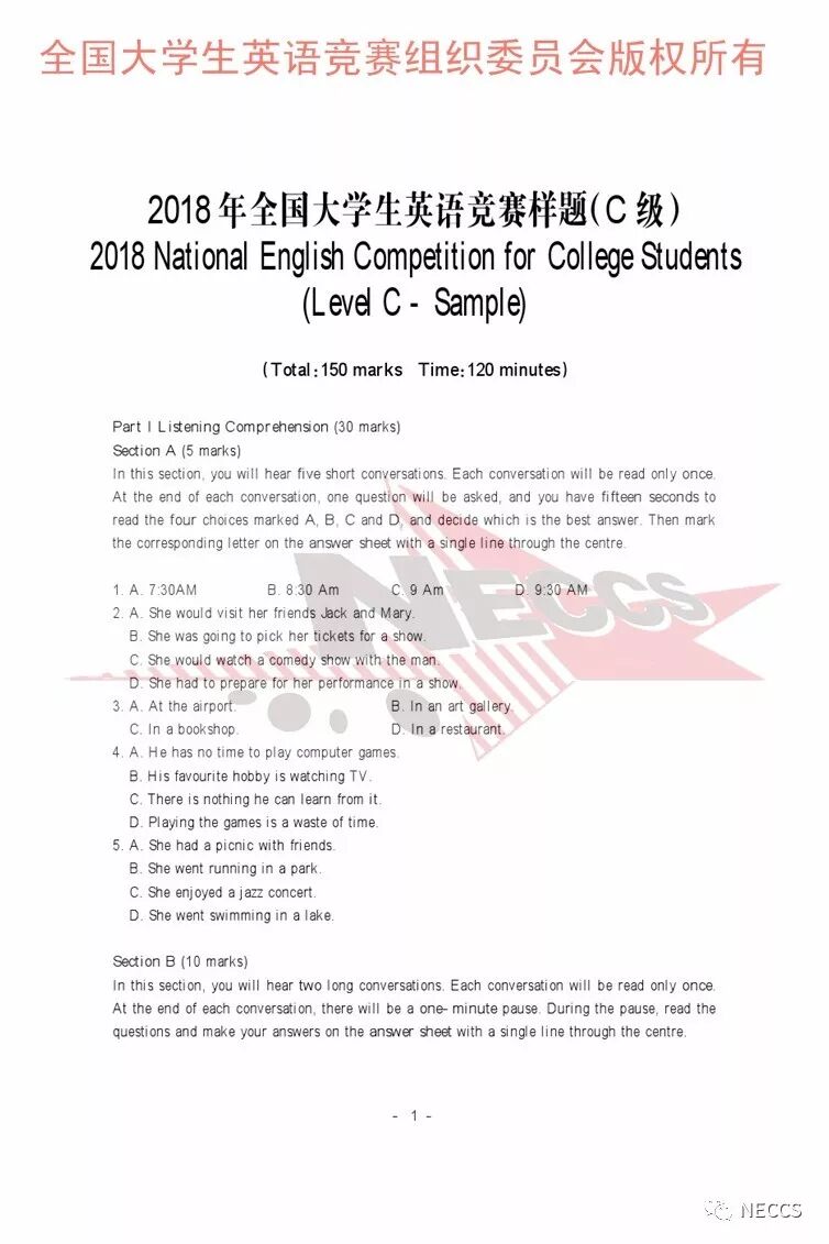 2018年全国大学生英语竞赛各类别样题、听力录音原文及参考答案版权归全国大学生英语竞赛组织委员会所有,任何单位、组织、个人未经允许不得以任何形式编辑、转载、使用,违者必究。