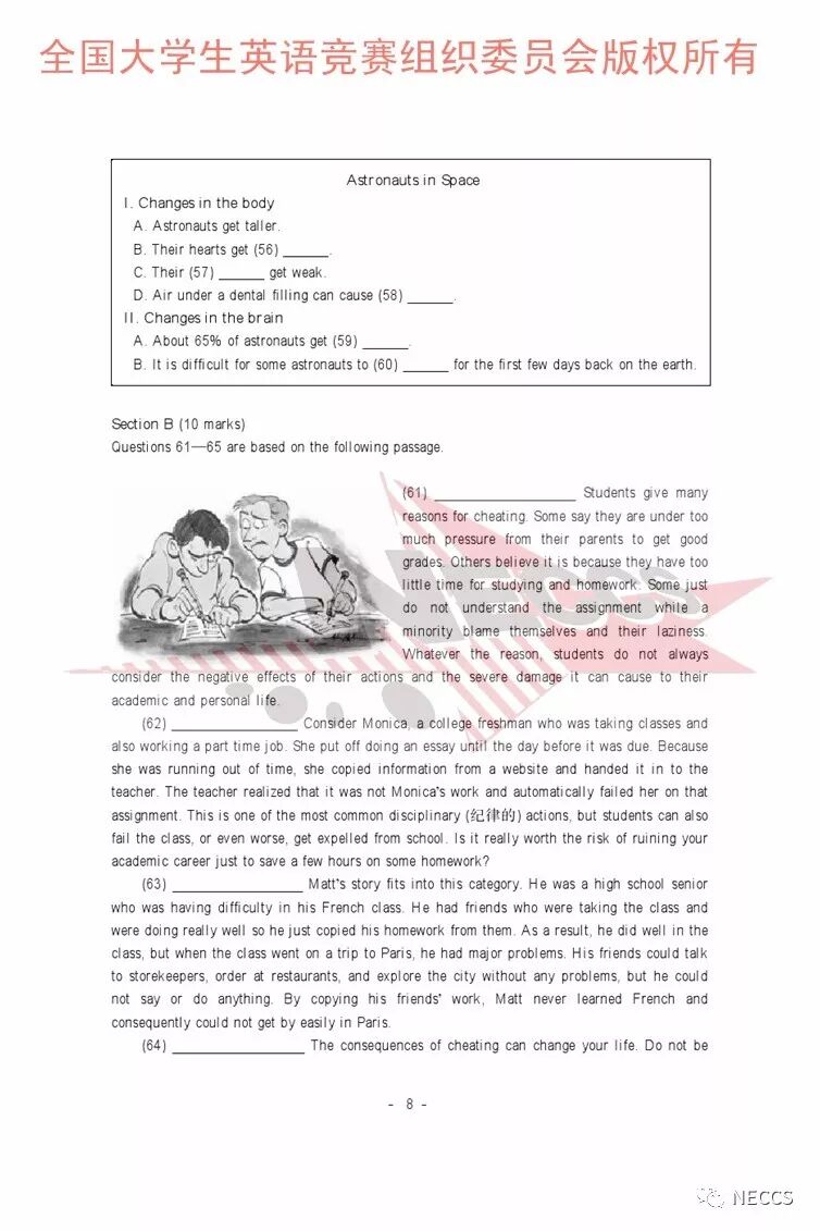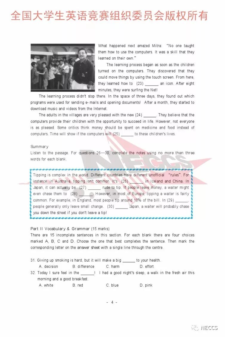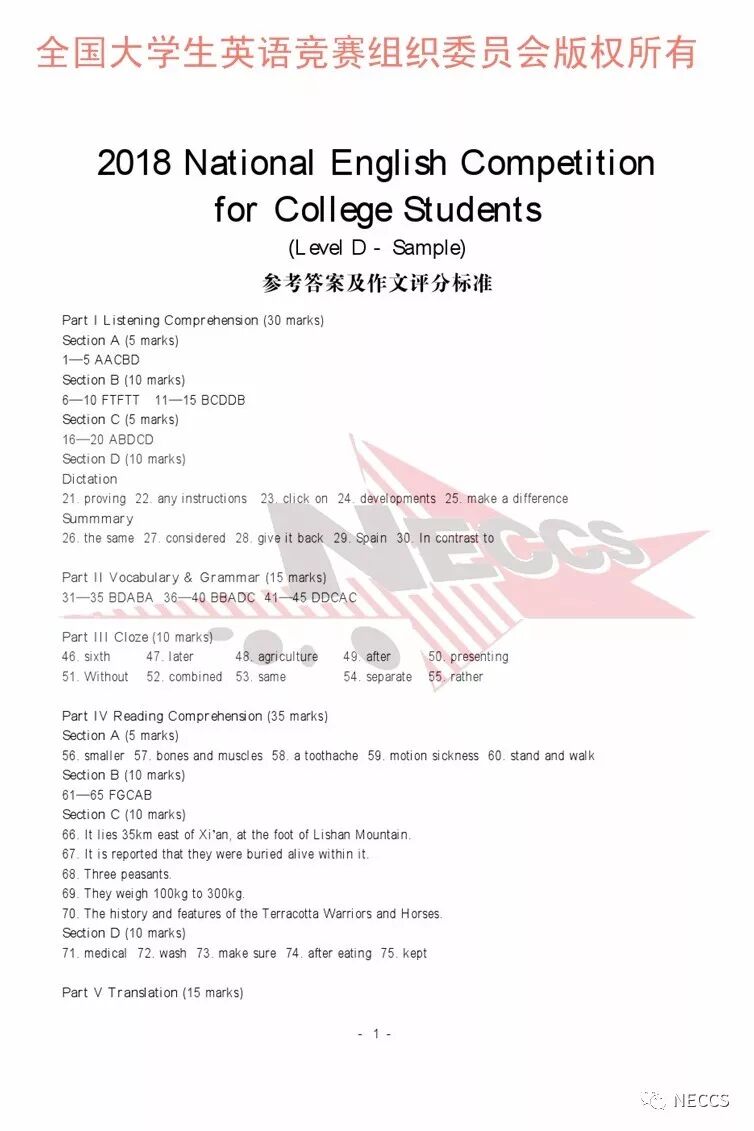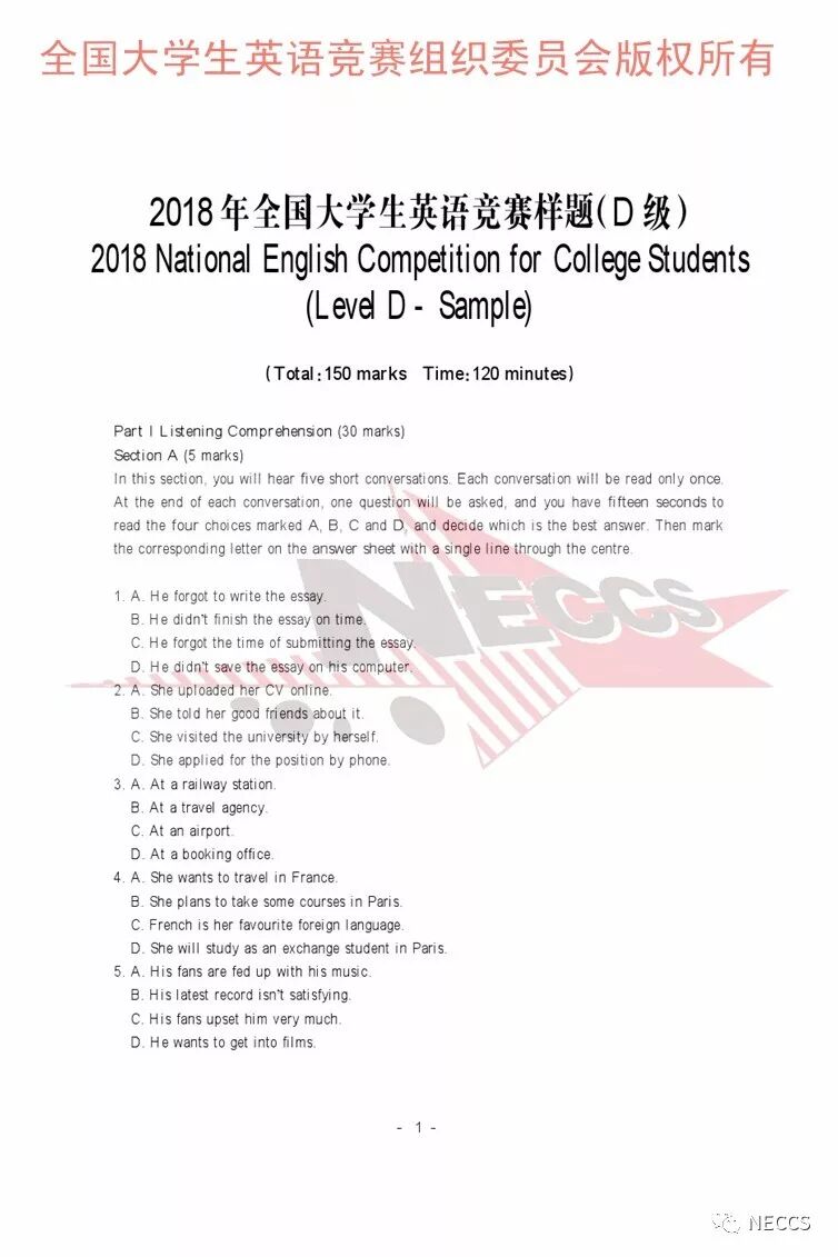 2018年全国大学生英语竞赛各类别样题、听力录音原文及参考答案版权归全国大学生英语竞赛组织委员会所有,任何单位、组织、个人未经允许不得以任何形式编辑、转载、使用,违者必究。