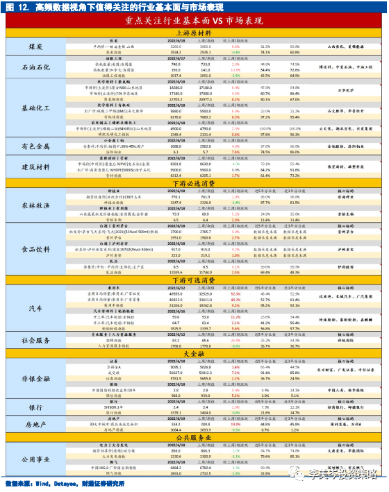 本期值得关注行业包括焦炭(铁水产量回升带动需求转暖)、油服工程(北美钻机数量维持恢复)、基础化工(MDI、TDI、DMC、磷肥价格上涨)、管材(成本端PVC价格回落)、种植业(玉米、金针菇价格上涨)、食品饮料(高端白酒价格上行,乳品价差维持扩大态势)、乘用车链条(乘用车销量、轮胎开工率维持恢复)、人力资源服务(招聘需求加速回升)、大金融(证券市场持续走强,银行保险方面利率保持回升,中大城市商品房成交回暖)、公用事业(动力煤与LNG天然气价格持续回落,成本压力缓解)。
