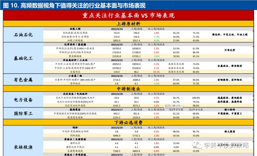 我们构建以价格类指标为主,周、旬频率更新的中观高频指标跟踪体系,从而挖掘值得关注的细分方向,并将其与相关领域核心标的进行匹配,以供投资者参考。