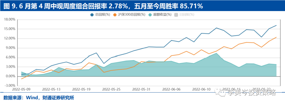 5)大金融方面证券及保险资产端继续向好。6月第4周万得全A指数继续反弹1.9%,保险资产端方面10年国债到期收益率提升近1个BP。