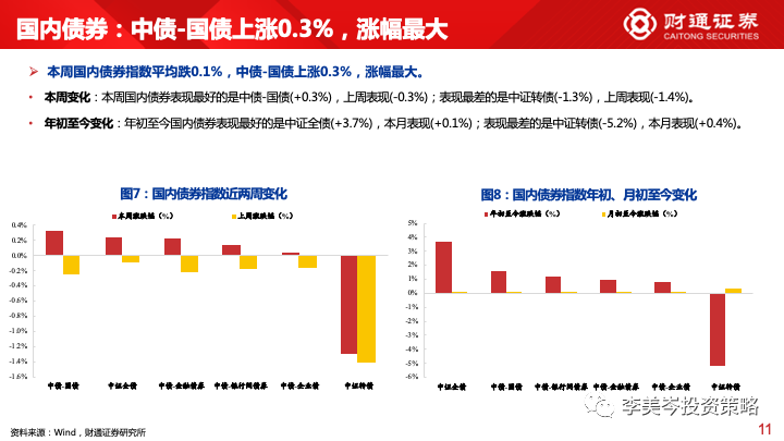 国内债券指数:表现最好的是中债-国债(+0.3%),上周表现(-0.3%);表现最差的是中证转债(-1.3%),上周表现(-1.4%)。
