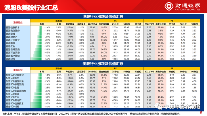 美股行业:表现最好的是公共事业(-1.6%),年初至今表现(+3.7%);表现最差的是材料(-5.0%),年初至今表现(-18.1%)。