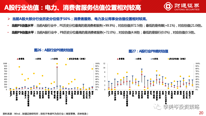 A股行业:PE历史分位最高的是消费者服务(+99.9%),对应估值(872.5倍);最低的是传媒(+0.1%),对应估值(21.0倍)。