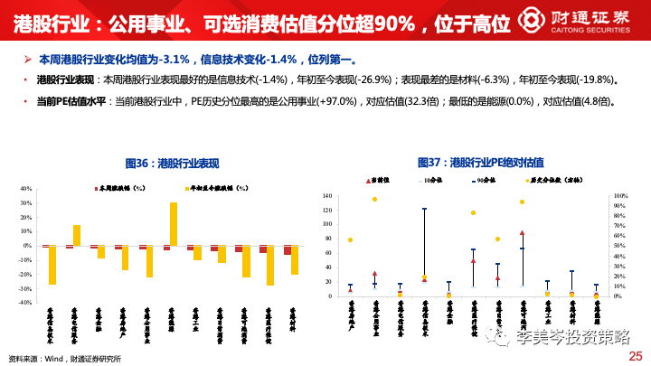 港股行业:表现最好的是信息技术(-1.4%),年初至今表现(-26.9%);表现最差的是材料(-6.3%),年初至今表现(-19.8%)。