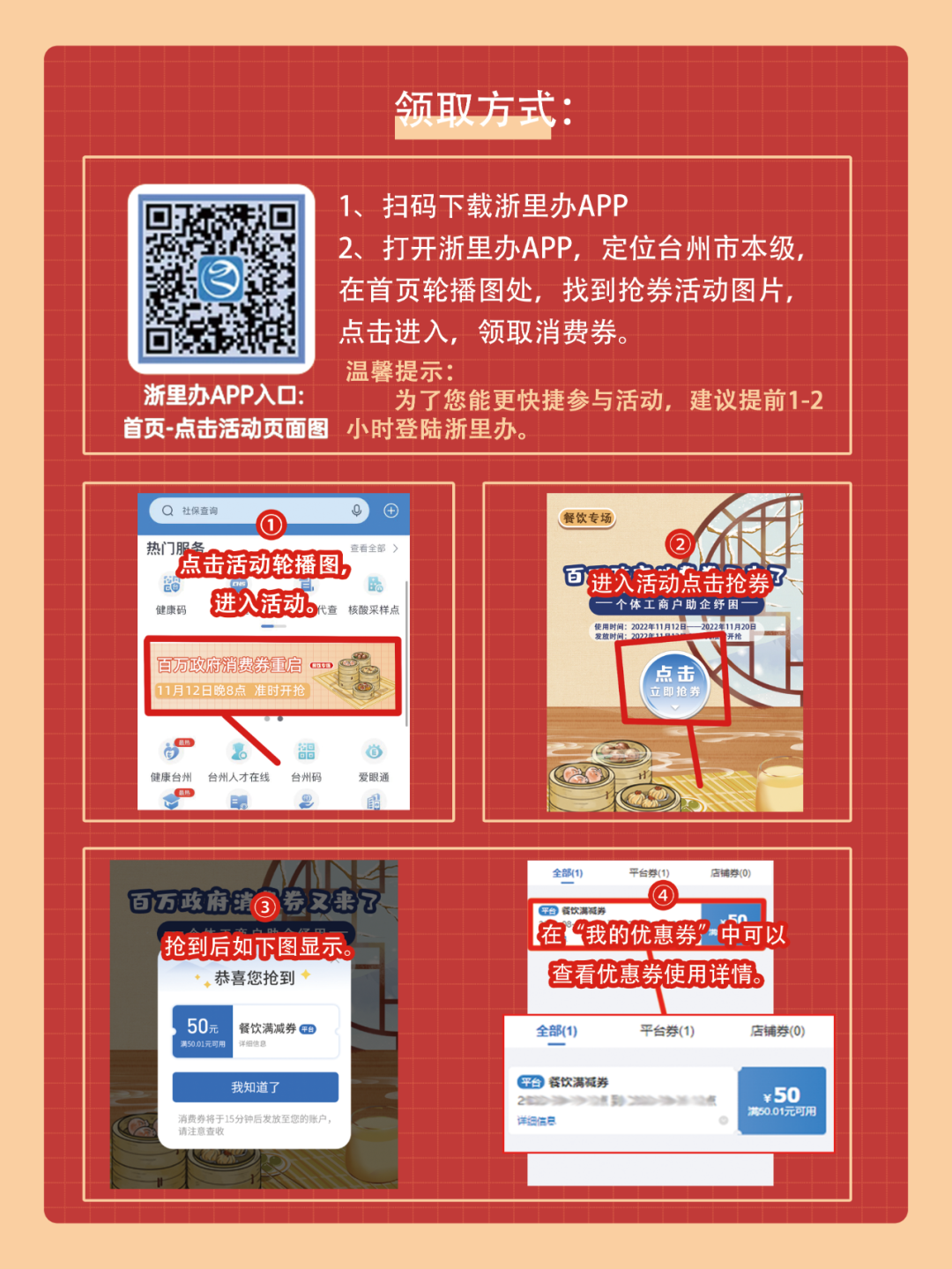 本次活动以电子消费券形式发放,并在浙里办付省心平台里领取。消费券为50元面值,每人限领取一张,可在活动参与的经营户中消费时,抵扣等额面值的消费额。消费券领取后请在规定期限内使用,过期未使用的消费券将自动作废。