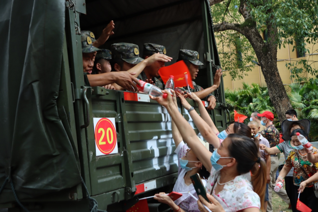 “来,把西瓜带在路上吃吧!”“喝口水再走吧!”……烈日下,来自一品街道的居民们顾不上高温,拉起感谢的横幅,在官兵们登上军车时,数千居民依依不舍,他们来不及将准备好的慰问品亲手交到子弟兵手中,便急忙追赶着撤退的车辆,将大包小包的矿泉水、西瓜等补给品投向驾驶室和车后斗。