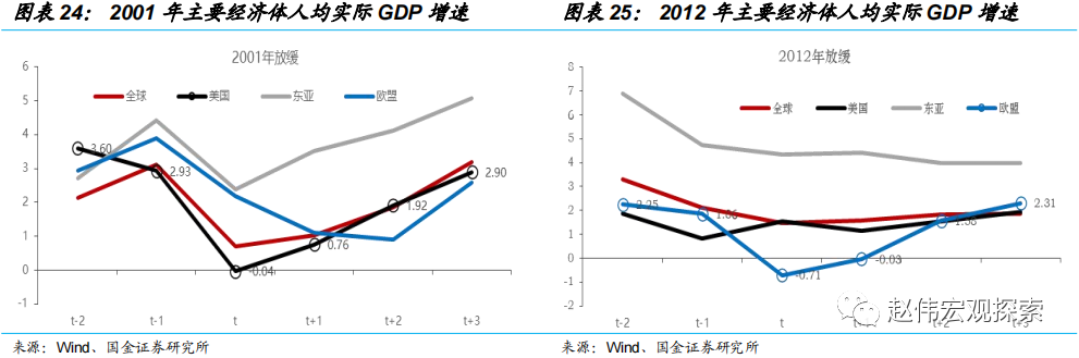 美国衰退与否,对全球经济运行有重要含义。1960年以来,美国出现了9次衰退 ,其中5次与全球衰退重叠,另外4次由于其它经济体的对冲,全球经济只是增速下降,并未出现衰退。典型案例如2000年科网泡沫破裂之后,美国在2001年出现了衰退,但欧盟和新兴市场都保持了正增长。1997-1998年亚洲金融危机时期正好相反,亚洲人均实际GDP增速从1996年的4.4%骤降到1998年的-0.6%,但美国和欧盟经济增速却处于上行通道,美国连续两年增速都高于3%,欧盟1997和1998年增速分别为2.5%和2.9%。欧债危机是另一次非同步衰退的案例,欧盟出现了负增长(-0.9%),但美国和亚洲 经济增速分别高达1.5%和4.4%。
