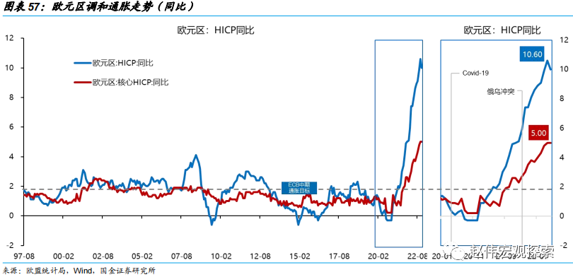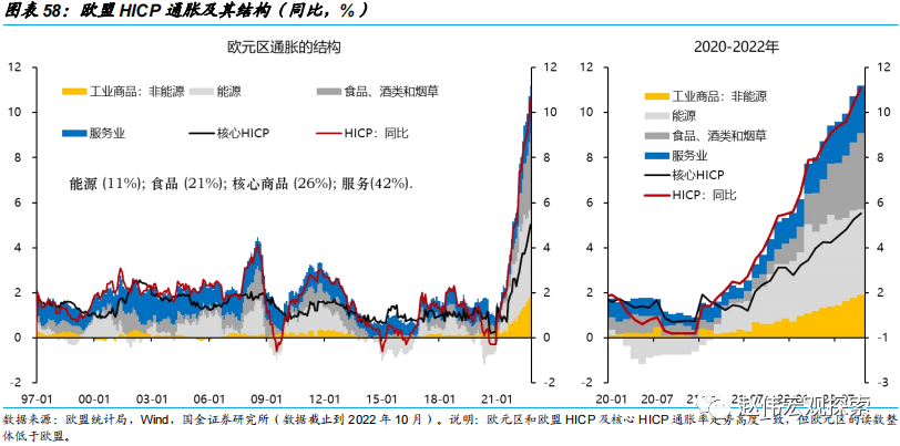 通胀的贡献来自商品和服务的方方面面,能源和食品贡献高达70%。商品和服务分项同比的高点都出现在10月。贡献率最高的依然是能源,其次是食品、酒类和烟草,两者合计在10月欧盟HICP通胀中贡献了约70%。自俄乌冲突以来,能源在通胀中的贡献持续下行,同比涨幅的高点出现在2022年3月,但下行斜率较小(3月44.3%,11月41.5%),环比波动较大(9-10月环比连续正增长,10月相比3个月前和6个月前都是正增长)。食品、酒类和烟草同比增速虽然远低于能源,但其权重是能源的两倍(21%),又由于食品价格动能及粘性更强,故很可能在2023年成为欧盟通胀的主导因素。