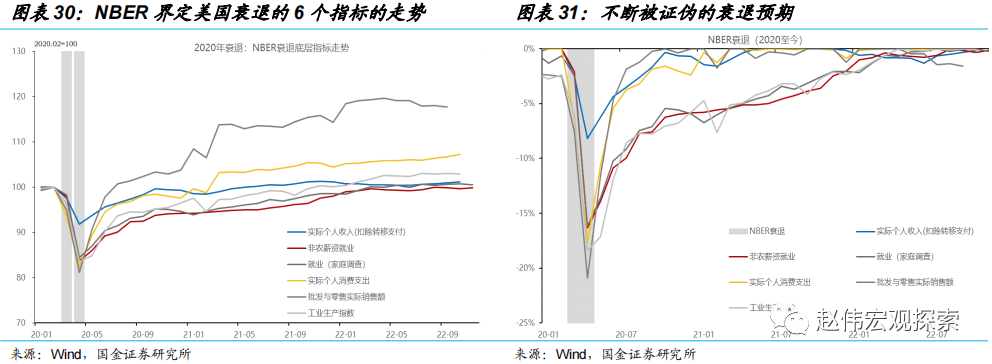 美国经济衰退风险在2022年3季度曾引起市场高度关注,但在不断被证伪的过程中,4季度市场选择理性忽视,开始交易“软着陆”。从NBER周期委员会观察的6个核心指标看,2022年美国经济不符合“衰退”的定义。截止到2022年底,只有“批发与零售实际销售额”呈现持续下行的态势,高点出现在2022年4月,这主要反映在耐用品消费上。但整体销售下行斜率并不大,因为服务消费在2022年始终保持强势。除此之外,其它5个指标多数为高位横盘态势。从相对于过去一个经济周期中(大约7年)的高点而言,也只有“批发与零售实际销售额”已经落入负值区间。