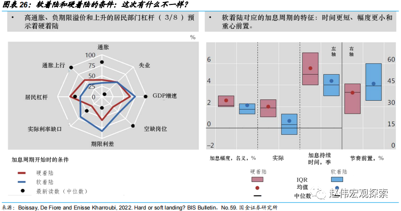 BIS基于对19个AEs和6个新兴经济体的70次货币紧缩周期的比较研究发现,以高GDP增速或高职位空缺率为初始条件的加息周期更有可能实现软着陆。这符合2022年的实际情况:2021年全球人均实际GDP增速高达4.8%,实际GDP增速5.7%;美国、英国、德国、法国等主要国家的职位空缺率处在历史高位。在其他条件相同的情况下,更短的加息周期和加息节奏的前置(front-loaded)也有助于实现软着陆。这同样符合2022年的实际情况。但是,另一方面,快速上升的通胀、处于低位的失业率、快速并大幅收窄(或已经倒挂的)的期限息差和快速上升的居民债务杠杆则会增加硬着陆的风险。