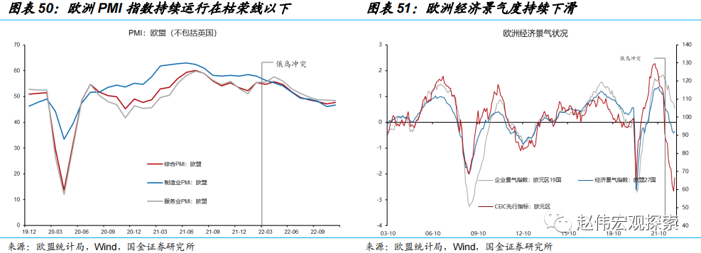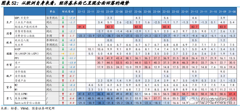 欧元区滞胀压力持续强化,2022年底已进入“负增长+高通胀”的深度滞胀区间。相比美国,欧洲制造业和服务业更早、且几乎同步进入衰退象限。根据标普PMI调查数据,欧盟制造业和服务业PMI分别在7月和8月跌至枯荣线以下,而后继续下降,前者领先美国4个月。Sentix投资信心指数在俄乌冲突之后就转为负值。3季度,随着能源价格的持续回落,以及意大利等国家旅游业景气度的维持,信心有所恢复,欧元区保持了正增长(环比0.3%),但净出口已经是负贡献。随着欧央行加息进程的推进,以及外需的收缩,4季度欧元区负增长(环比)是大概率事件。