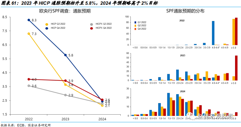 随着全球经济放缓和能源价格的持续回落,欧元区整体通胀的高点在2022年10月已经出现。核心通胀还在创新高,但动能已经放缓。受劳动短缺和工资上涨的驱动,服务通胀在核心通胀中的贡献率或稳步上行,使其拐点滞后于整体通胀,下行斜率更小。欧洲通胀压力广泛分布于商品或服务的方方面面,虽然高通胀科目数量有所下降,但不改变潜在通胀上行的趋势。乐观的是,长期通胀预期依然被锚定在略高于2%的水平,表明“物价-工资”螺旋的风险依然偏低。