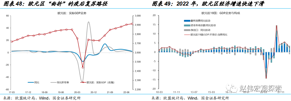 欧元区经济复苏进程大致与美国同步,但过程却“一波三折”,受俄乌冲突的影响,2022年增速持续下台阶,至今产出缺口尚未收敛。2020年2季度是欧元区实际GDP的低点,3季度开始强势反弹,但由于疫情的持续扰动,随后连续两个季度出现环比负增长,直到2021年2季度才再次进入复苏。相比而言,美国直到2021年底的复苏进程都比较稳定。2022年本应该是欧元区产出缺口收敛的年份,但进程再次被俄乌冲突打断,全年增速持续降档,至今产出缺口尚未收敛。实际上,欧元区可以说是“旧伤未愈,又添新伤”,弹性本来就偏弱。2008年金融危机之后的复苏进程曾被2010-2012年欧洲危机打断,直到疫情之前都未回到潜在路径上。