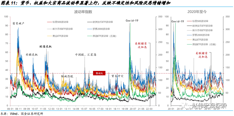 大类资产波动率指数(VIX)普遍上行,部分触及“警戒线”。波动率的上升反映的是投资者风险偏好的下降。受通胀预期和货币政策紧缩的影响,股票和债券的波动率都显著抬升。在联邦基金利率还在3%、10年期美债利率低于4.5%的情况下,美国国债的流动性压力就已经凸显,财政部部长耶伦已多次公开表达了对该问题的担忧,并在研究用回购(buyback)流动性差(off-the-run)的债券的方式来提高国债市场的流动性。英国国债市场在特拉斯政府颁布“迷你预算法案”后一度出现“流动性危机”,隐含波动率急剧上行,直到英格兰银行干预后才趋于稳定。