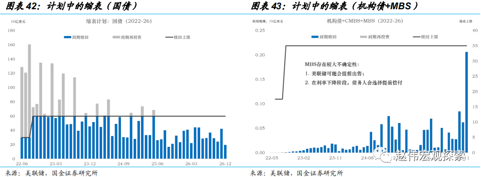 先加息、后缩表是正常化的一般流程。所以,加息的进度快于缩表是预期之内的。在充足准备金框架下,FFR是主要政策工具,也是货币政策影响需求的主要变量,缩表的功能一是辅助加息,二是降低美联储资产负债表成本(准备金利率)。由于美联储一般不会提前出售持有的证券,而是等到其自然到期,所以,缩表的进度取决于持有证券的剩余期限结构。其中,国债的路径有较高的确定性,如果当月到期的国债规模超过减持上限,超过的部分会续做。