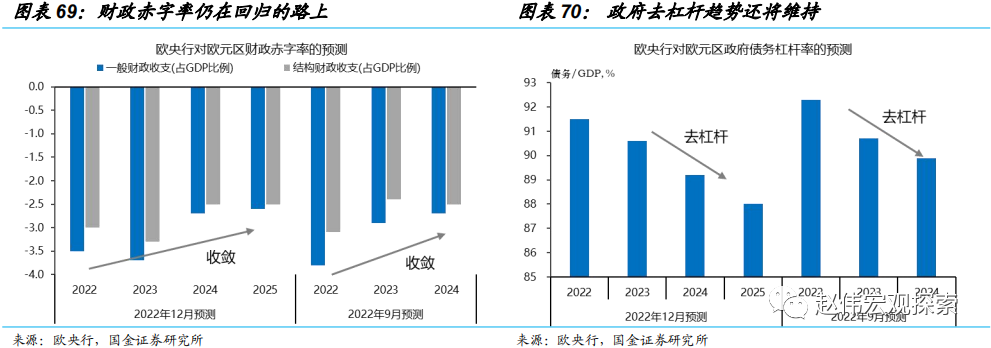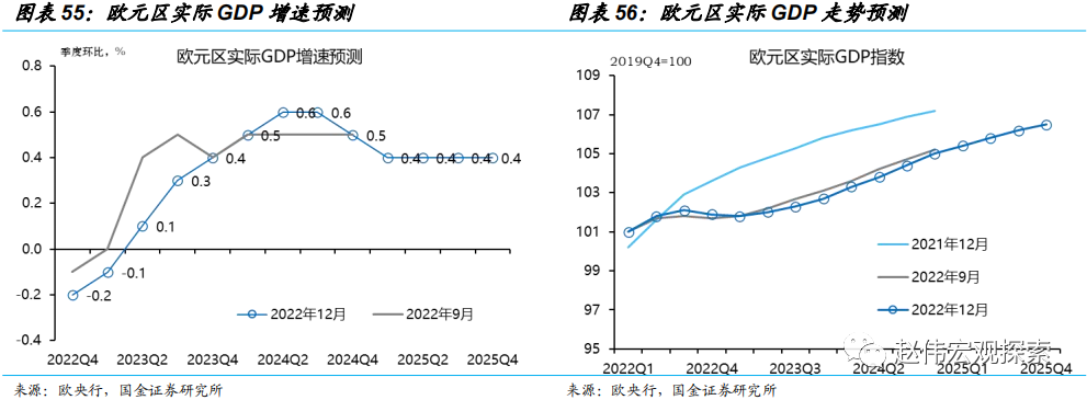 欧央行12月经济预测摘要整体指向更严峻的滞胀环境:负增长+高通胀。在实际GDP增速方面,由于经济重开的“长尾效应”,ECB将欧元区2022年经济增速上修至3.4%(9月预测为3.1%)。但由于通胀超持续预期,叠加货币紧缩的累积效应和全球经济的放缓,将2023年增速下调至0.5%(9月预测为0.9%)。从季度环比上来看,今年4季度和明年1季度均为负增长(-0.2%和-0.1%),相比9月的预测均低0.1个百分点。
