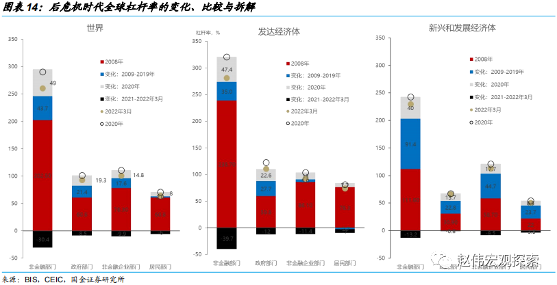 截止到2021年底,发达国家和新兴市场国家政府债务杠杆率均创下了1880年以来的历史新高(分别为124.7%和65.3%),2021年已经进入新一轮的去杠杆阶段。EMDEs的杠杆率在向AEs靠拢,AEs更早进入去杠杆阶段。比较AEs与EMDEs的杠杆率发现,从2008年到2020年,前者NFS的杠杆率都较高,但差值(AEs-EMDEs)在不断缩小(从127%降到78%)。分政府、非金融企业和居民三个细分部门而言,2008年底,AEs三个部门的杠杆率都高于EMDEs,到2020年底,差值分别出现了扩大、反超和收敛三种不同的特征。