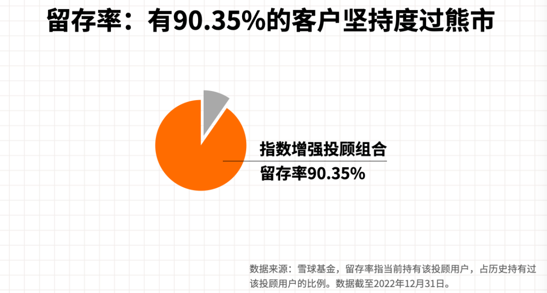 其实就股票基金市场整体来说,投资者还是追涨杀跌的。2022年4-5月份、10-11月份,市场在5星级的时候,很多老股票基金,被投资者赎回30%-50%。但是对螺丝钉系列投顾组合的老司机来说,2022年5星级的时候,反而是投入最多的阶段。下面这张图,就是2022年2季度到2022年底,中证全指的走势,以及同期主动优选、指数增强的申购量。图中蓝色柱子就是每周金额,橙色的曲线是中证全指的走势图。可以看出,4-5月份5.4星级,市场在2022年最底部的时候,主动优选和指数增强,申购反而是最高的阶段。也就是说,很多投资了主动优选和指数增强的老司机,在2022年5.4、5.3星级市场底部,敢于投入自己最多的资金。等到之后市场上涨,在低迷阶段积累的这些便宜筹码,就可以获得更高的收益了。之前有基金公司做过调研,投资股票基金,平均持有时间长度,只有3个月。大多数投资者,看到市场波动,很容易就卖出了。不过对螺丝钉系列投顾组合的老司机来说,大部分能管得住手、拿得住。意思是,有多少比例的投资者,坚持在2022年熊市,持有指数增强投顾组合,度过了熊市底部。在2022年市场行情普遍低迷的情况下,指数增强投顾组合有超过90%的留存率。意味着大部分关注螺丝钉的朋友,能够保持耐心,坚定持有,等待黎明的到来~▼降低成本,节约费用约3000万+