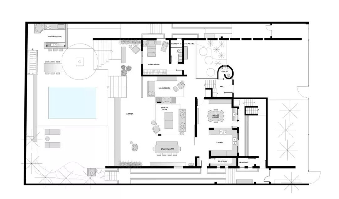 住宅一共两层,下层生活空间与游泳池通过一块木质平台连接,让主体空间得到了充分的延展。