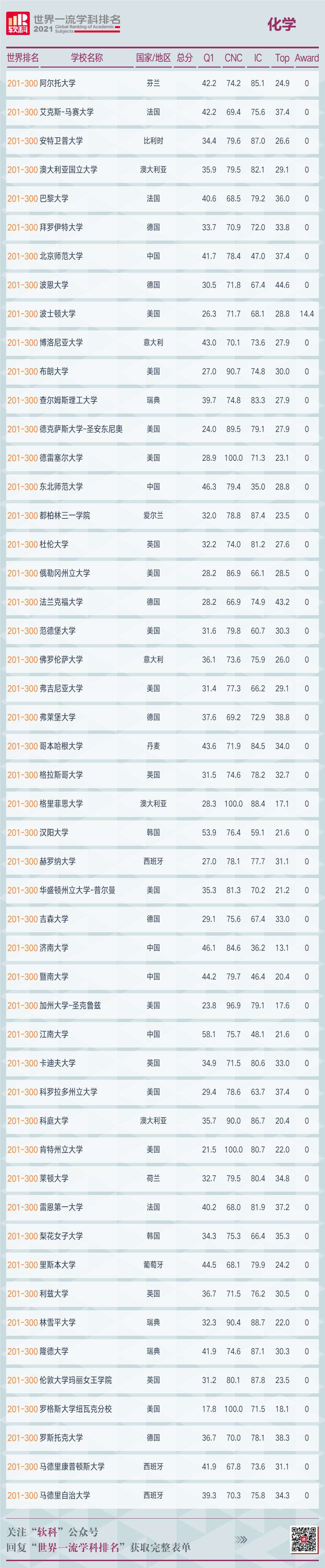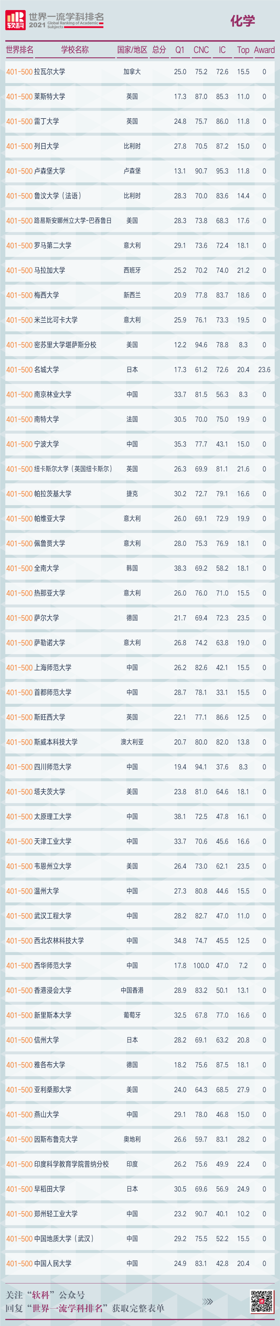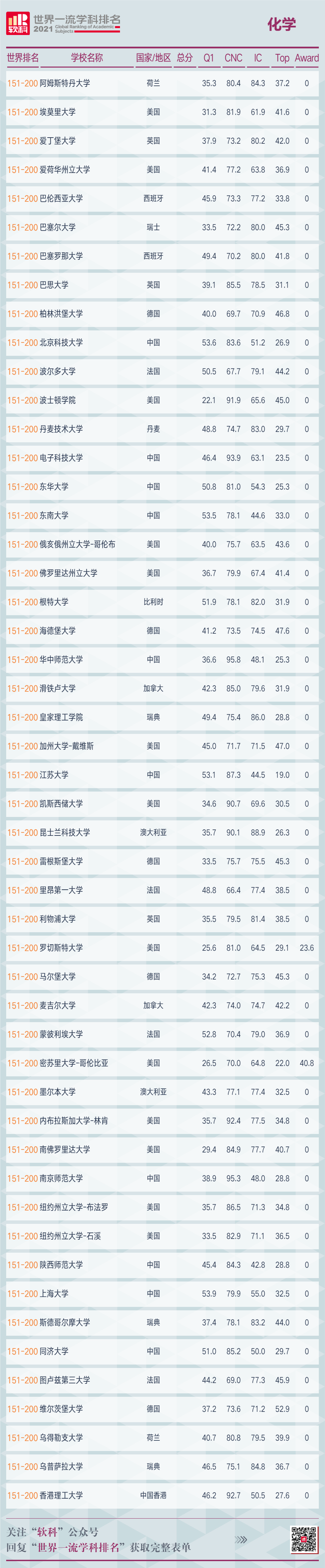 软科于5月26日正式发布2021软科世界一流学科排名(ShanghaiRanking's Global Ranking of Academic Subjects)。在化学学科中,共有500所高校上榜,排名全球前5的高校依次为加州大学-伯克利、斯坦福大学、麻省理工学院、西北大学(埃文斯顿)、哈佛大学。中国内地高校中,表现最好的为中国科学技术大学、清华大学、北京大学。
