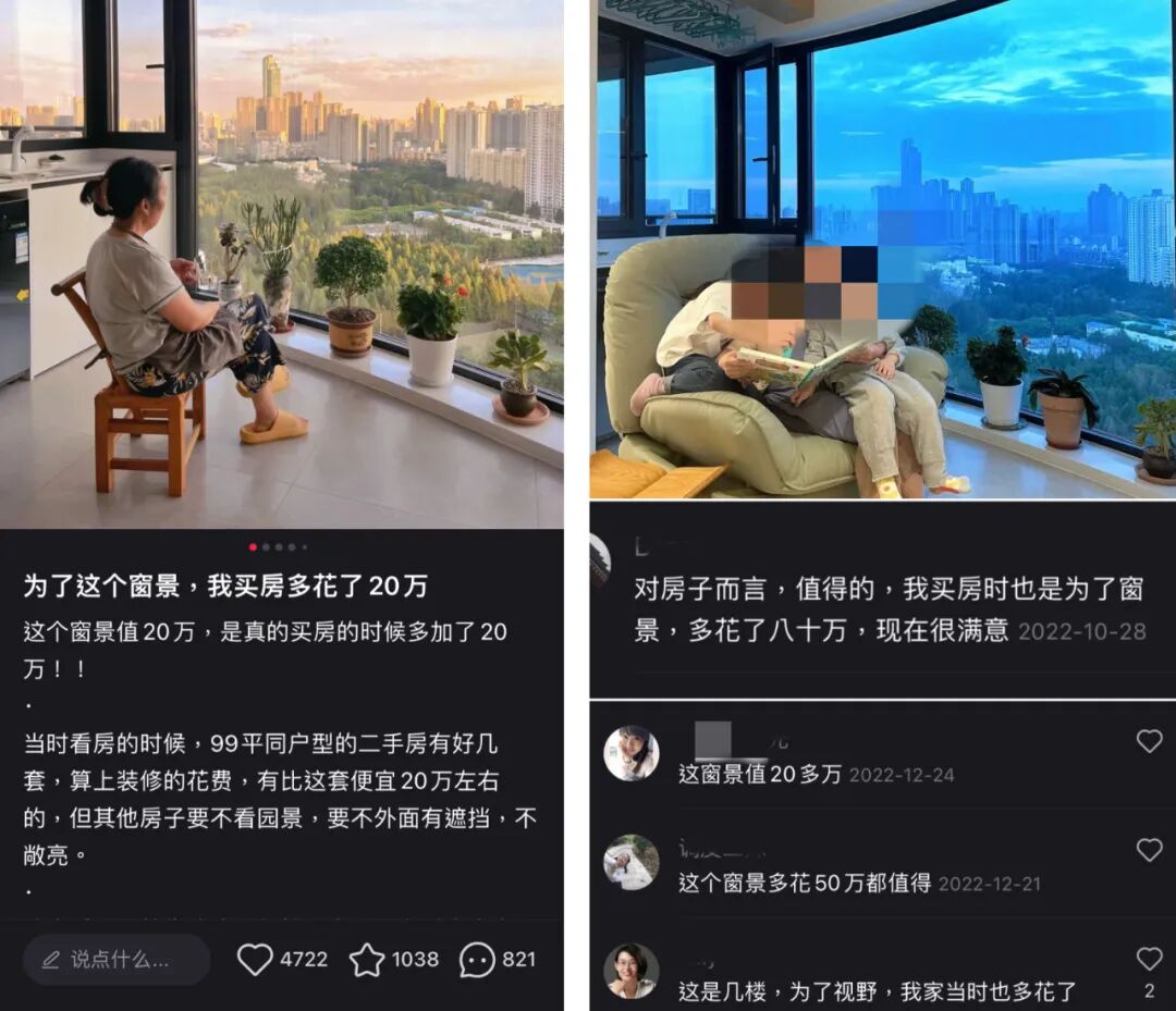 也有爱养花养草女性购房首看阳台以及室内采光,买不起别墅,那就选高层一楼带院子的,或者选顶楼带露台的。甚至有网友为了喜欢的窗景,多花了几十万元。