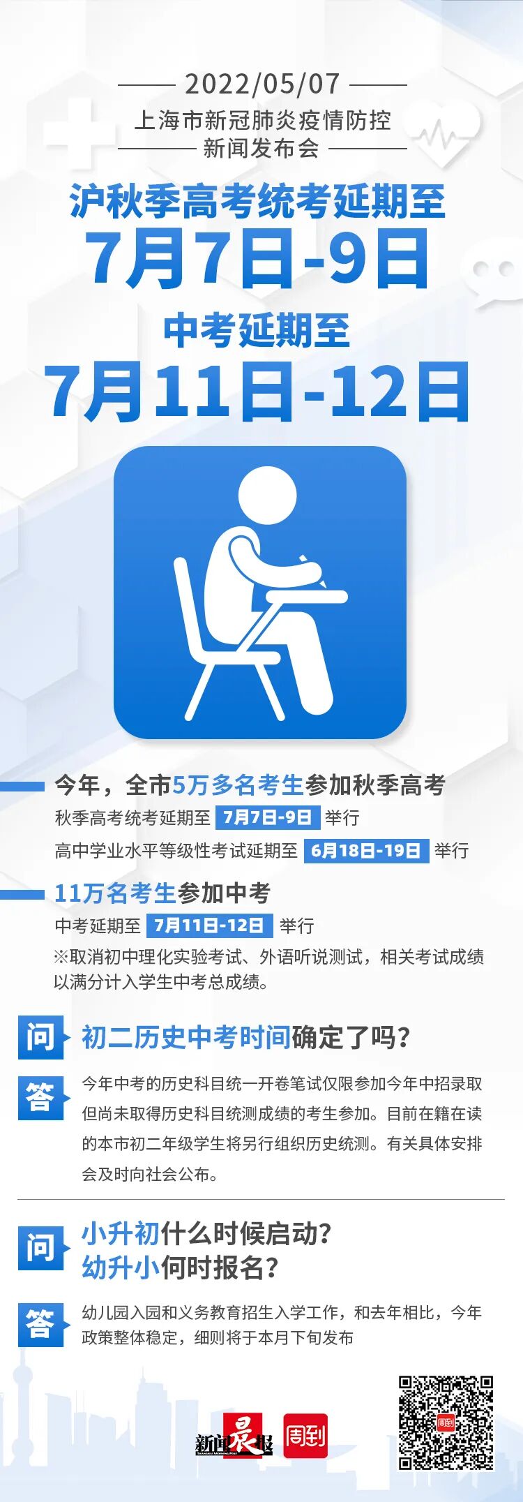 接下来,会动员教育系统内外的力量,进一步做好两方面工作,一是做好对考生的关心和帮助,尤其是对感染新冠以及有密接隔离经历的考生、对家长奋战在抗疫一线和学习条件相对困难的考生,“一人一策”细致做好工作;二是优化完善应急预案,创造“应考尽考”的条件,在设立常规考点和考场基础上,根据防疫需要设立应急考点和考场。高考中考延期之后,遭遇台风、雷电、暴雨等天气的概率会增加,对此,教育、气象、公安、交通、水电保障等部门将紧密联动,做好模拟演练,有效防范应对。上海会严谨细致地做好高考中考的相关准备工作,请考生们放心,请家长们放心!