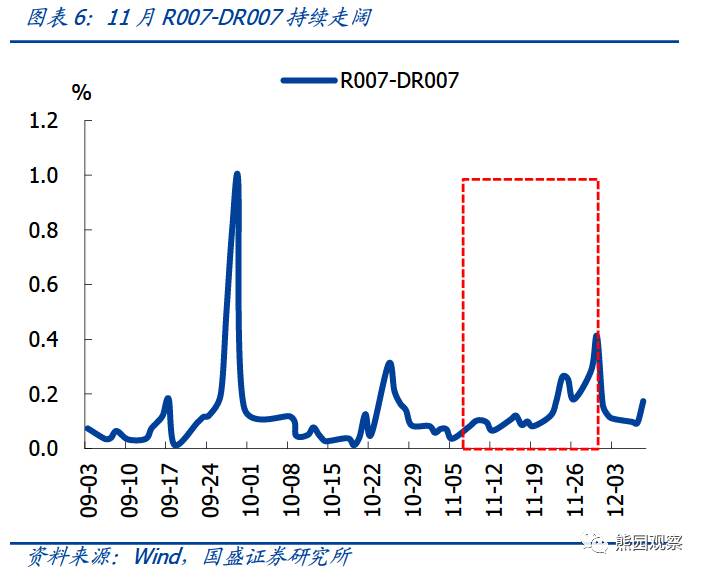 >11月M1同比录得3%、较上月抬升0.2个百分点,但仍处于历史较低水平,虽然地产销售及融资环境有所改善,但房企对于拿地以及新开工仍较为谨慎(10月30城土地流拍率仍在30%左右);M2同比回落0.2个百分点至8.5%,信贷低迷是主要拖累项。存款来看,11月新增存款1.14万亿,同比少增9600亿,其中:财政存款同比多减5424亿元,与财政支出节奏加快有关;非金融企业存款同比多减8773亿元,可能与银行对金融机构融出减少有关(R007-DR007之差在11月持续走阔)。