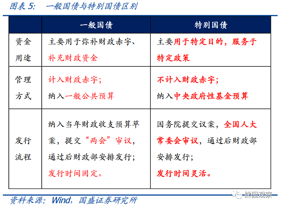 2、机制上看,相比一般国债,特别国债在资金用途、管理方式、发行流程3方面存在差异,其中:特别国债不计入财政赤字,人大常委会审议即可,发行时间比较灵活。