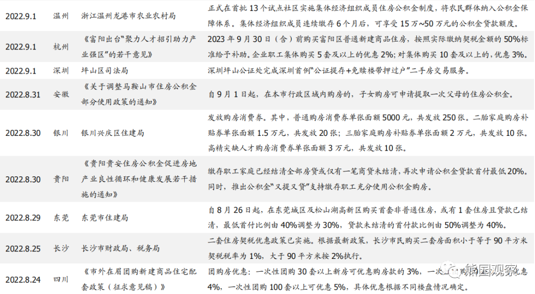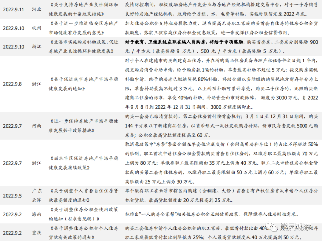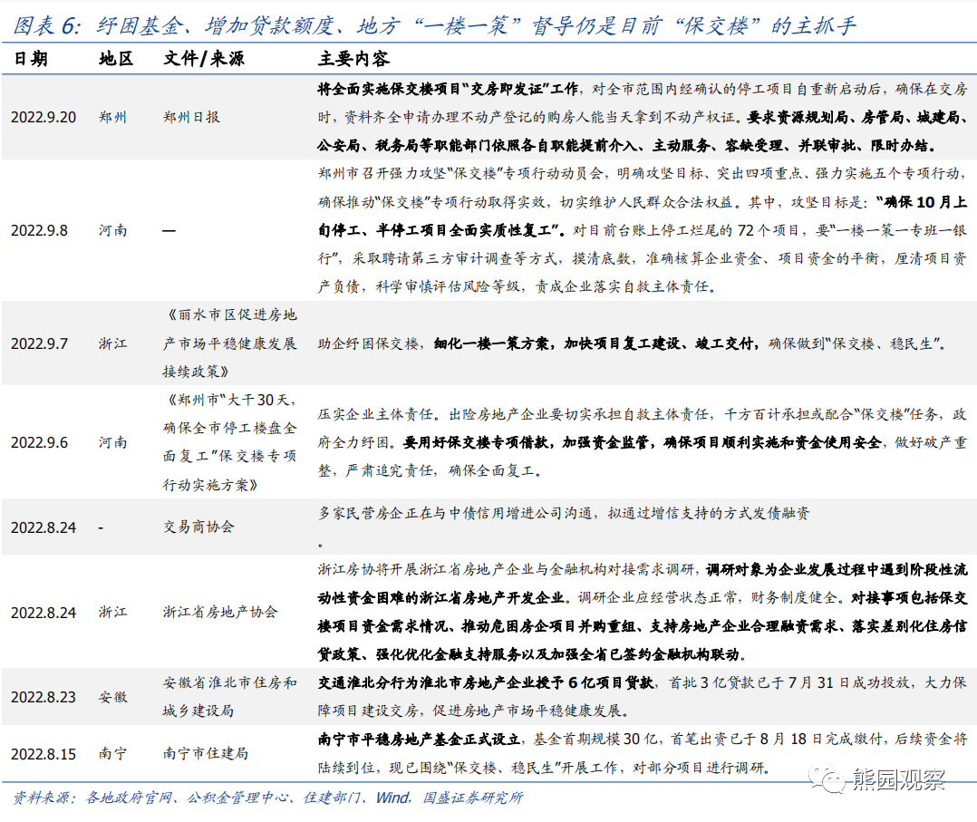 1、需求端继续花式松地产,供给端积极推进“保交楼”。需求端,继续围绕两类政策:一是放松购房资格,如苏州放开限购,天津新市民购房,上海人才购房等;二是缓解购房压力,如洛阳和长沙契税补贴,多地降低首付比、提高公积金贷款额度,温州将农民纳入公积金保障体系且后续可享受公积金贷款等;供给端,围绕“保交楼”,南宁房地产平稳基金、浙江推动金融机构和房企对接需求、通过增信支持方式支持房企发债融资等,河南明确要求确保10月上旬停工、半停工项目全面实质性复工,郑州要求 “交房即发证”。
