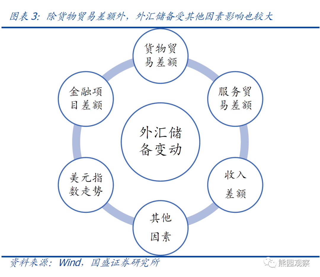 >影响外汇储备的其他因素包括:货物和跨境资金统计口径差异、外汇收付主体结售汇意愿等。具体看,从货物贸易到外汇储备至少要经过以下步骤:货物贸易→资金跨境支付→商业银行结售汇→央行外汇储备。其中:1)货物贸易采用海关口径统计,资金跨境支付采用国际收支口径统计,两者统计口径存在差异,加上赊销、预付款等因素,可能导致货物贸易和资金跨境支付不一致。2)外汇收付主体(企业或个人)得到资金跨境支付后,可以自由选择是否跟银行结售汇。一般而言,如果人民币有升值预期,外汇收付主体倾向于加速跟银行结汇;反之,外汇收付主体结汇意愿偏低。3)如果商业银行未按时与央行结汇,则外汇会留存在商业银行体系,同样不会转化为外汇储备。![]()
