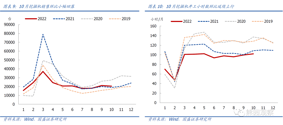 10月工程机械销售环比略降、但国内销售延续改善;挖掘机使用时长延续上升。10月挖掘机销量2.0万台,环比减少3.2%,相比2021年同期高约8.1%;其中国内销量11350台,环比增加7.9%,相比2021年同期低约10.0%,前值为低约24.5%;10月挖掘机平均开工102.1小时/月,环比上升2.4小时/月,相比2021年同期仍偏低约6.6小时/月,前值为偏低0.8小时/月。整体看,挖掘机销售环比小幅回落、但内销有所改善,加上挖掘机开工时长增加,指向基建仍在发力。![]()