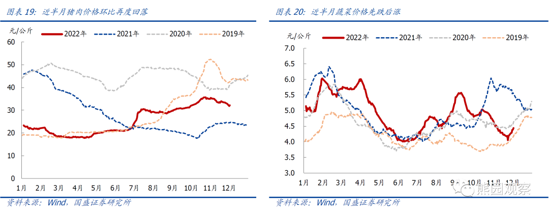 中游工业品:钢铁、水泥价格小幅分化。近半月来,螺纹钢现货价格环比小涨0.2%,前值为跌0.2%;相比2021年同期下降17.4%,前期为跌18.9%,跌幅略有收窄。水泥价格指数环比续跌,近半月环比小跌0.7%,前值为跌0.2%;相比2021年同期仍偏低约23.9%,跌幅略有收窄;绝对值看,截至12月2日,水泥价格指数收于151.9,续创近年同期新低。下游消费品:价格延续下跌。近半月来,猪肉价格环比续跌3.2%,前值为跌3.6%;相比2021年同期仍然上涨34.3%,前值为涨41.2%,涨幅延续收窄,指向猪肉价格对通胀的拉动可能有所回落。蔬菜价格再度小幅回落,近半月小幅下跌0.9%,前值为跌8.2%。![]()