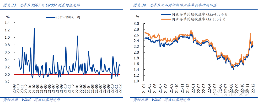 二、流动性跟踪:月末流动性边际趋紧、但政策方向未变;中美利差倒挂继续收窄流动性投放:本周由于跨月,央行公开市场操作加码,但幅度弱于9月底和10月底,指向流动性总体平稳适度。整体看,近半月央行通过OMO实现货币投放3450亿元,货币回笼4290亿元,净回笼840亿美元。货币市场利率:近半月来,货币市场利率延续分化。其中:DR007均值环比小幅上升4.1bp,R007、Shibor(1周)均值环比分别回落11.4bp、11.0bp;趋势上看,近半月货币市场利率先升后降,主因跨月导致货币利率阶段性冲高。R007、DR007利差均值环比走阔23.3bp,指向月末流动性阶段性趋紧,银行和非银之间利差阶段性走阔。同业存单到期收益率冲高回落,3月期AAA+、AA+同业存单到期收益率一度升至2.59%、2.67%,近半月分别环比上行5.5bp、6.4bp。整体看,继续提示:11.25降准最直白的信号就是我国货币政策并未转向,将有助于打消市场对货币政策可能收紧的担心;短期看,年底年初大概率会降息,尤其是降LPR。![]()