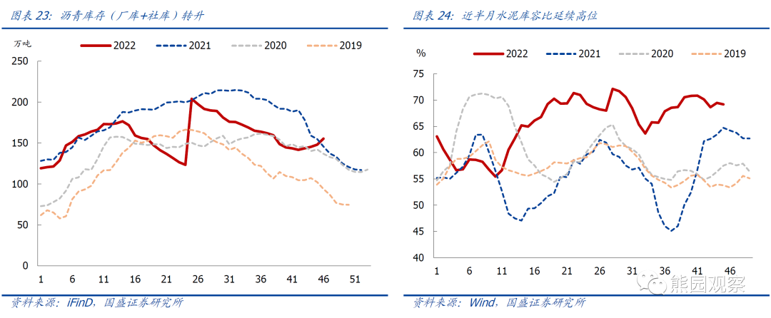 4.库存:电厂存煤回落,钢材、水泥库存续降,沥青库存回升电厂存煤小幅回落。近半月沿海8省电厂存煤均值3135.9万吨,环比减少0.8%,前值为增加5.1%,指向随着冬季来临,电厂存煤可能延续回落。截至12月2日,钢材库存(厂库+社库)1082.9万吨,环比减少50.1万吨,前值为减少164.6万吨,整体库存水平延续偏低、仅略高于2019年同期。沥青库存(厂库+社库)环比续增7.3万吨至151.7万吨,库存绝对值创近年同期新高。水泥库容比环比续降0.1个百分点,绝对值仍显著高于往年同期,相比2021年偏高约5.3个百分点。![]()