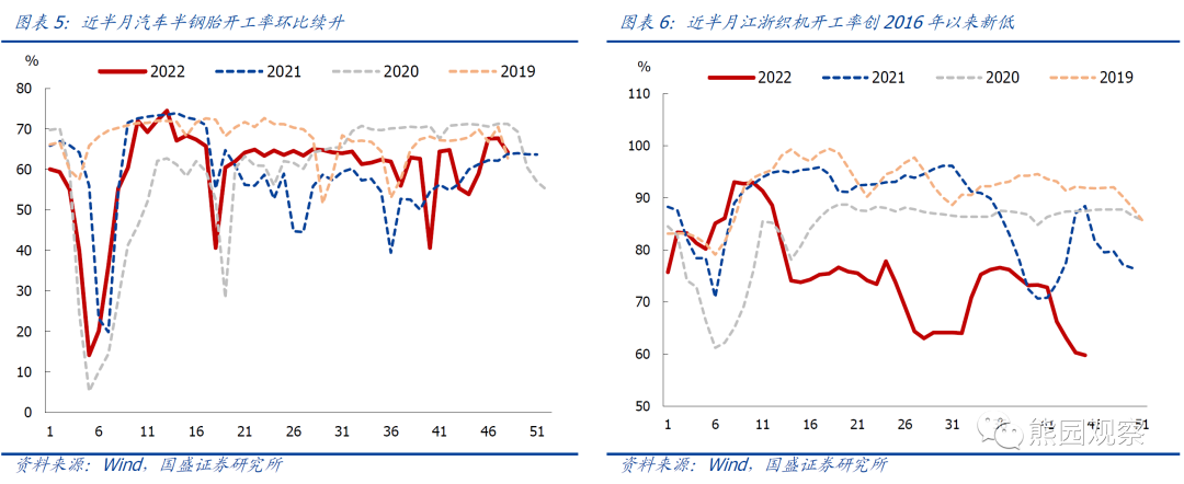 中下游开工延续分化。近半月来,汽车半钢胎开工率环比续升2.7个百分点至65.9%,前值为升8.7个百分点,相比2021年同期偏高约3.0个百分点;趋势上看,先升后降,12.1当周开工率有所回落。江浙地区涤纶长丝开工率环比续降4.6个百分点至60.1%,其水平已低于2020年初疫情暴发之初的水平,创2016年以来最低水平,指向江浙疫情影响下,纺织工业恢复仍需时间。![]()