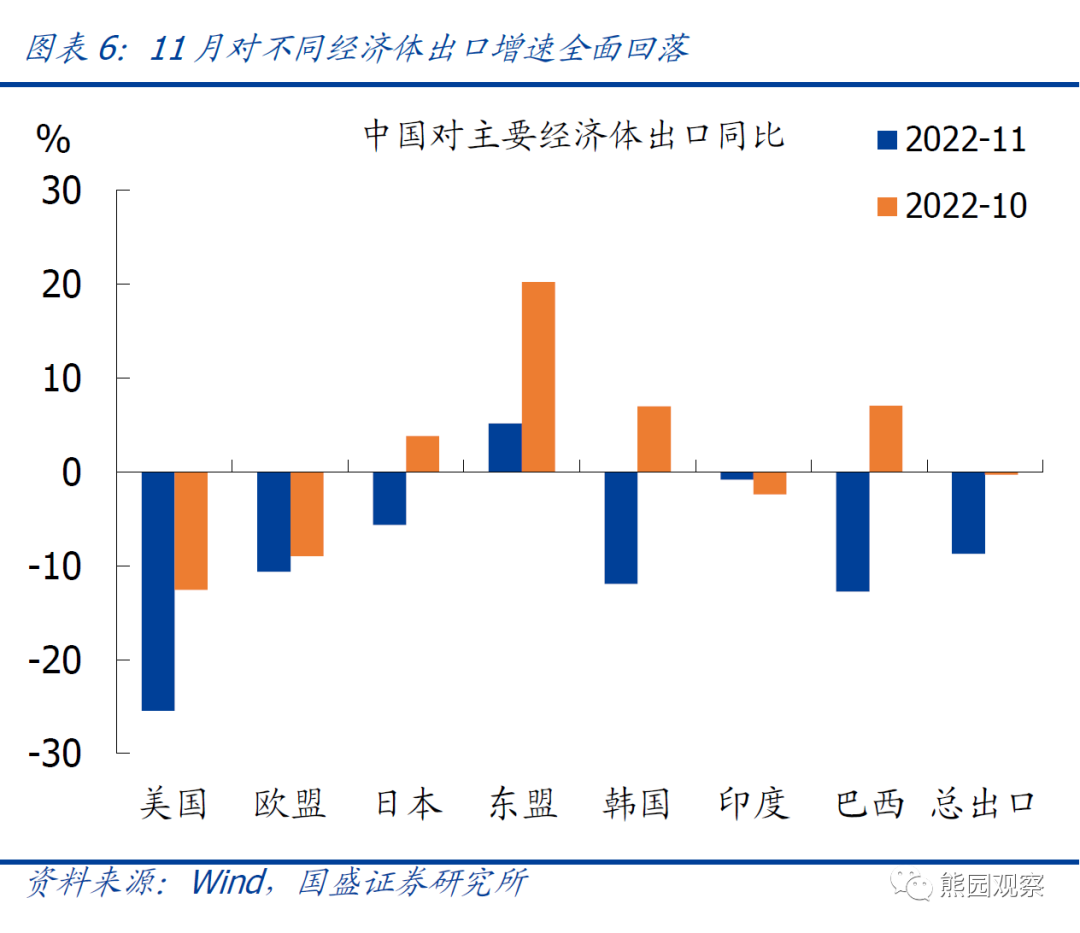 >分国别看,对不同国家出口全面回落,东盟仍有支撑,美日韩等降幅较大。发达国家中,对美出口降幅扩大12.9个百分点至25.4%,对欧盟、日本出口降幅分别扩大1.7、9.4个百分点至10.6%、5.6%;新兴市场国家中,对东盟出口下降15.1个百分点至5.2%,仍有支撑;对韩国、巴西出口降幅分别扩大18.9、19.8个百分点至11.9%、12.7%。![]()