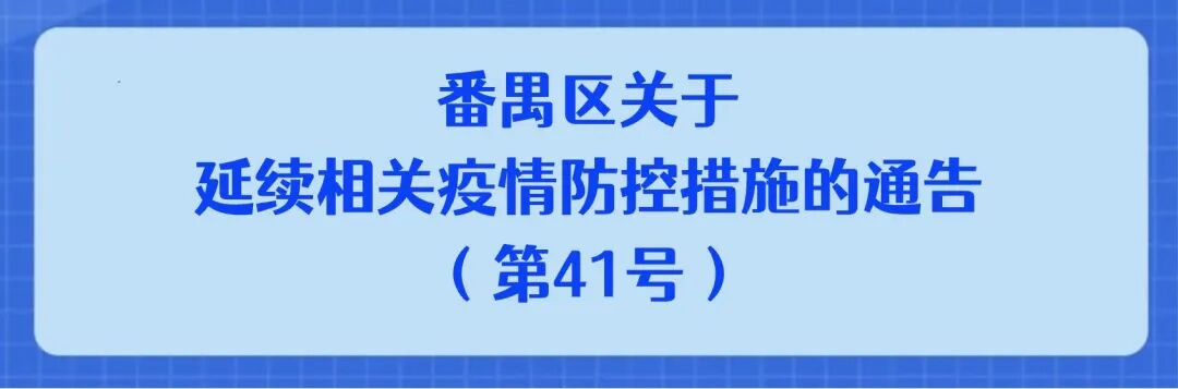 根据当前疫情形势发展和防控工作需要,经研究,现决定2022年10月26日发布的《广州市番禺区新型冠状病毒肺炎疫情防控指挥部关于在全区范围内进一步加强社会面疫情防控措施的通告》(第40号)的实施时间延续至2022年11月1日。